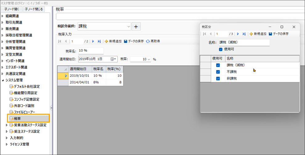 消費税率改定に対応するため、旧税率(8%)と新税率(10%)を期間別に登録しておくことで、過去データも正確な税計算が可能になります。