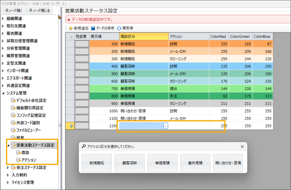 「新規追加」をクリックし、新しく追加された行の「商談区分」および「アクション」列をクリックすると、それぞれのマスタに登録したものから選択できます。