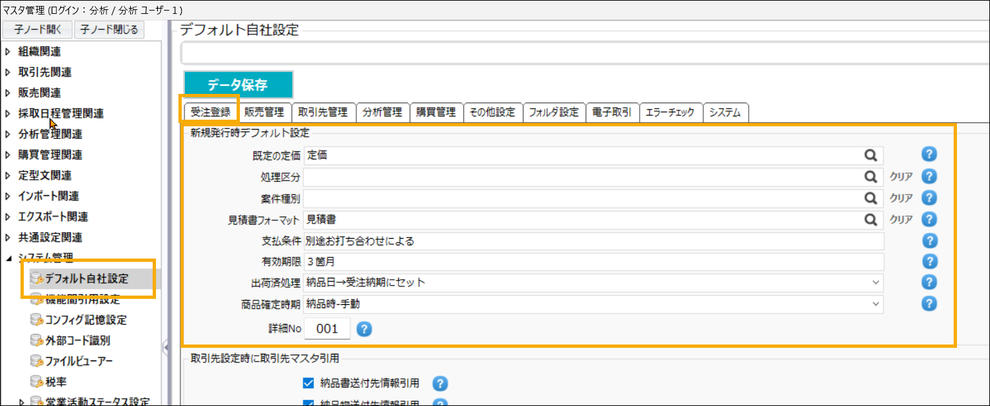 受注登録時にこの枠に登録したデータを「分析管理」側に引用可能です。