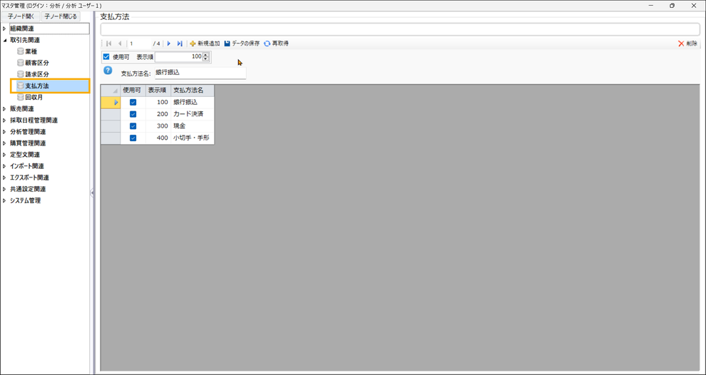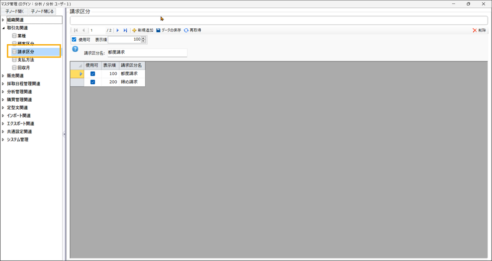 登録した顧客区分は取引先マスタで選択でき、顧客の性質(顧客の獲得方法など)で管理・分析に活用できます。