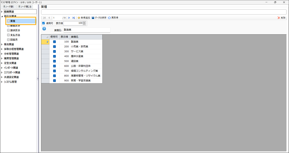 登録した業種は取引先マスタで選択でき、業界ごとの区分管理や分析に活用できます。